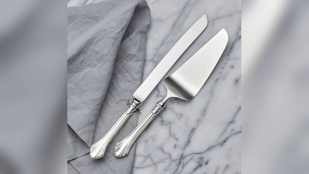 A wedding cake knife and server set is a matching pair used to cut and serve cake.